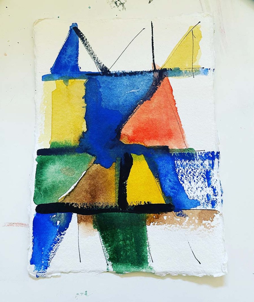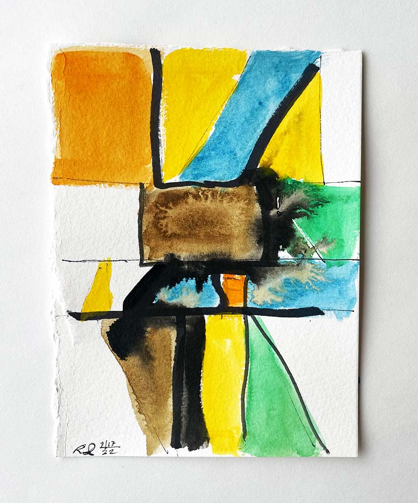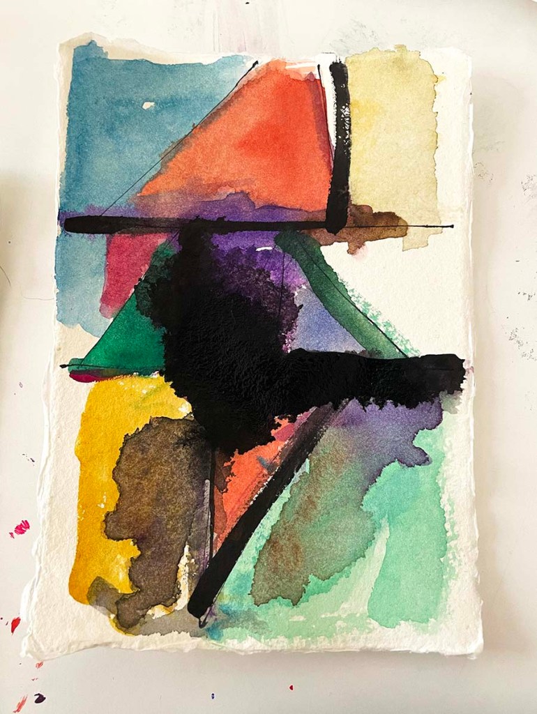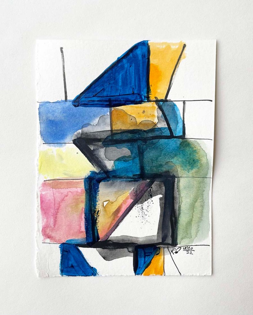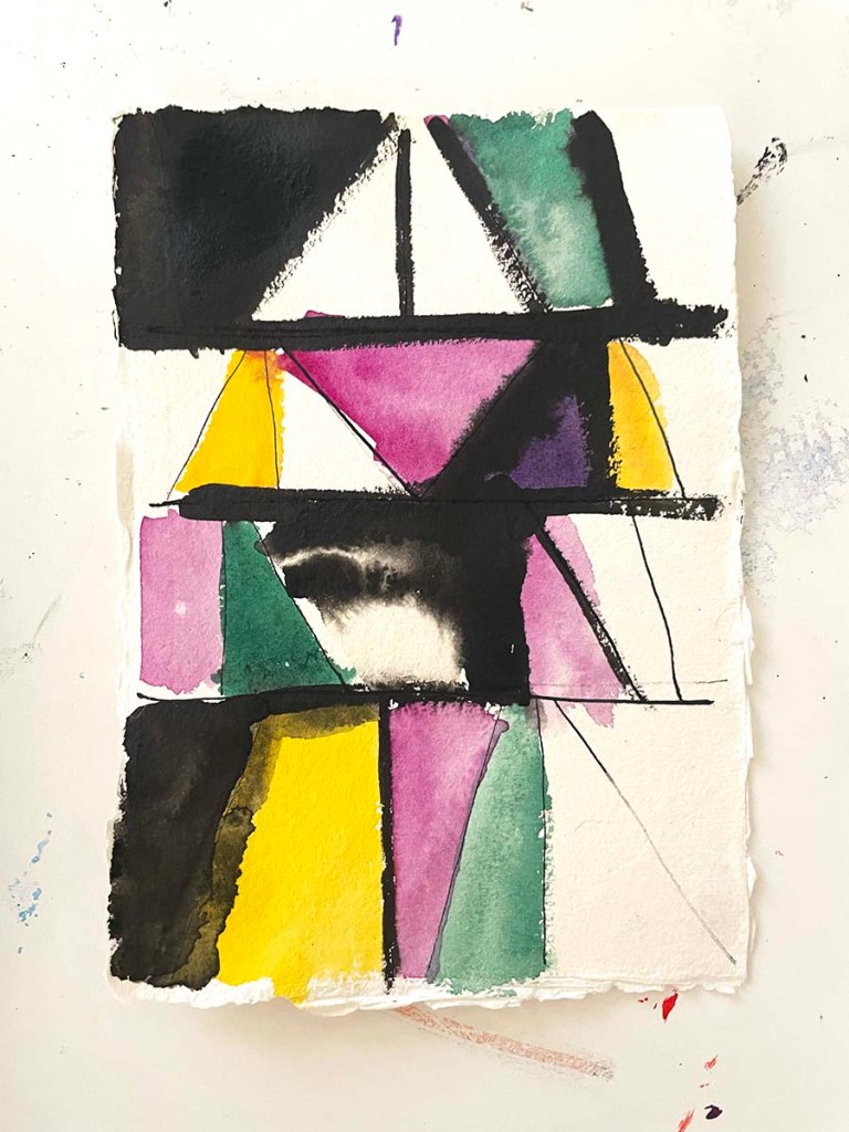 I created the series El Desierto Pintado (The Painted Desert), as a symbol that is a reflection of how humanity interprets and celebrates the land. The name originated after the captain Francisco Vazquez de Coronado first saw the geological phenomena, while on a quest to find the mythical Cíbola—Seven Cities of Gold. This series is part of the Vistas suite, which is an overarching collection of series that enables me to visually describe my encompassing experiences within landscapes. The idea is that one peers outward towards vertical and horizontal planes. Each series is an avenue for me to explore gestures, continual contour lines of forms, and to capture changing structures from different viewpoints. Aptly named, El Desierto Pintado, the juxtaposition of light with geological forms creates both vivid and washed-out colors. In this series, I synthesize the visual and geological experiences by abstracting the forms, creating irregular triangular shapes that create patterns and rhythms that transfix the eyes—leading to some comprehension on how indigenous beings created visual motifs through meaning and celebration of their culture and way of life. Through the process of creating these works, I discovered techniques that helped inform each proceeding artwork within the series.